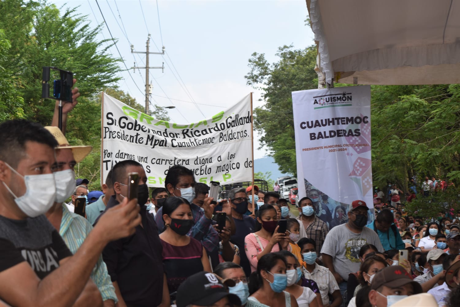 Fortaleciendo con acciones el impulso a la actividad turistica del municipio de Aquismón la tarde de este jueves 14 de Octubre el Presidente Municipal Cuauhtémoc Balderas Yañez asi como el Gobernador del Estado José Ricardo Gallardo Cardona, acompañados de funcionarios y ciudadanos dieron el banderazo de arranque una de las mayores obras de impacto para el Pueblo Mágico, la Ampliación y Pavimentación del tramo carretro Aquismón-Crucero.