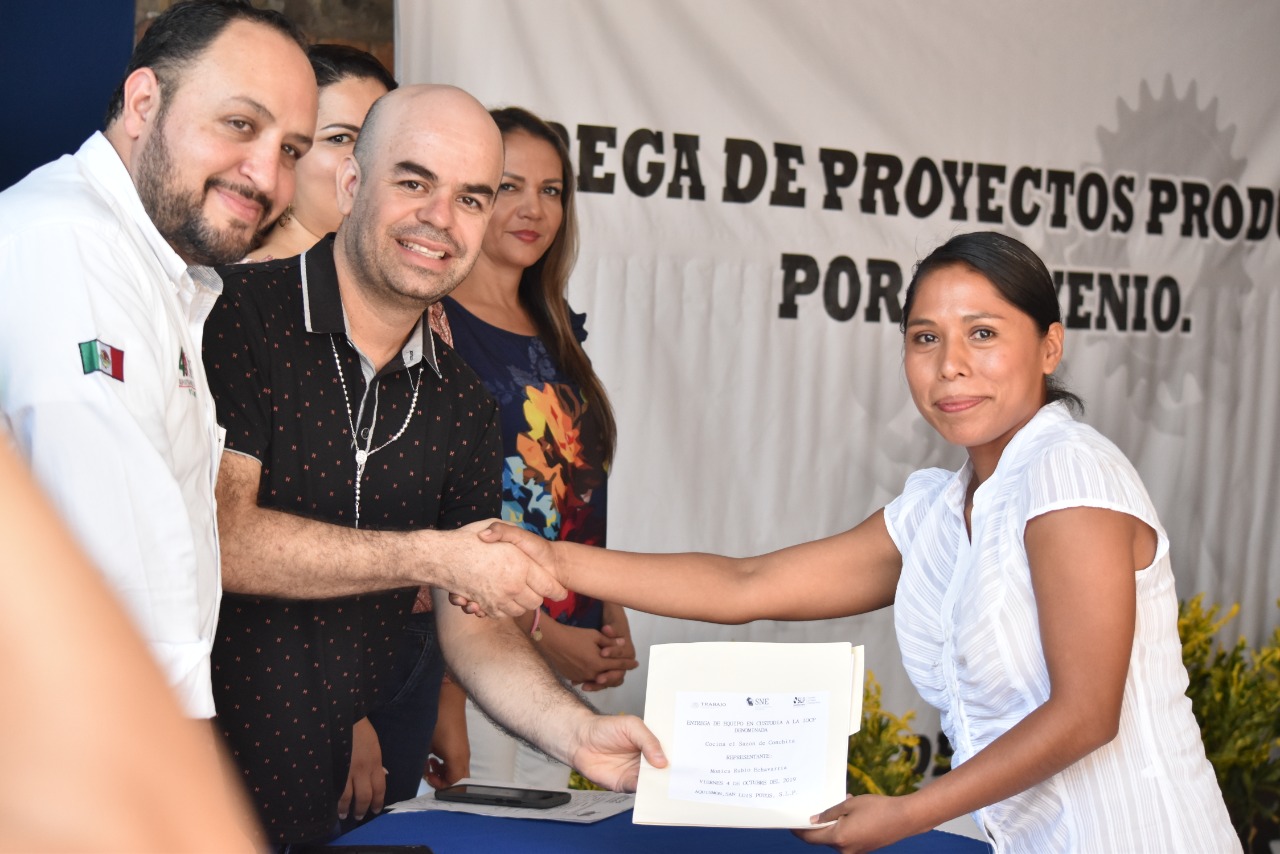 Aquismon.SLP.-Con el compromiso de seguir trabajando por apoyar para mejorar la calidad de vida de los Aquismonenses, entregando herramientas que garanticen generar fuentes de empleo, la mañana de este viernes 04 de octubre, el Secretario General del Ayuntamiento Arturo Medina Barajas en representación del Presidente Municipal Oscar Suarez Mendoza, el Director del Servicio Nacional del Empleo Luis Alberto González Olvera así como la Directora de Proyectos Productivos Claudia Ledezma Martínez llevaron a cabo la entrega de proyectos a beneficiarios de distintas localidades de nuestro municipio.