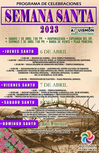 Éste sábado 1 de abril a partir de las 7 de la noche comienza la programación cultural de Semana Santa en Aquismón, con una tradicional huapangueada en la explanada de la plaza principal; mañana continúa con la presentación de una banda de viento.