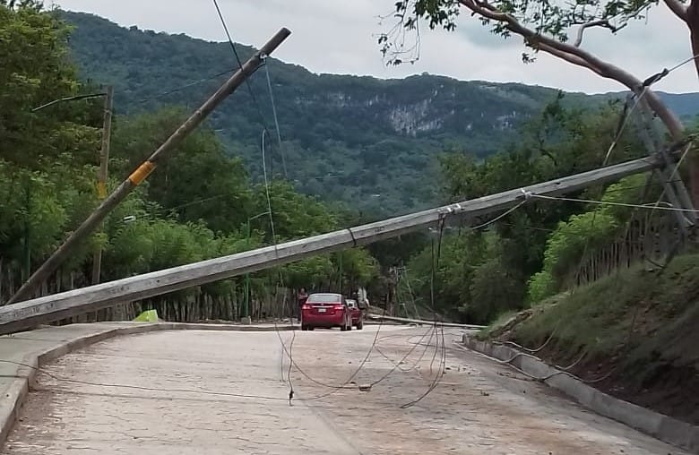 Aquismon.S.L.P.- La Dirección de Policía y Tránsito procedió esta tarde a desviar el tráfico de la carretera principal de acceso a la cabecera municipal luego de que dos postes de energía eléctrica con sus cables cayeron sobre el pavimento.