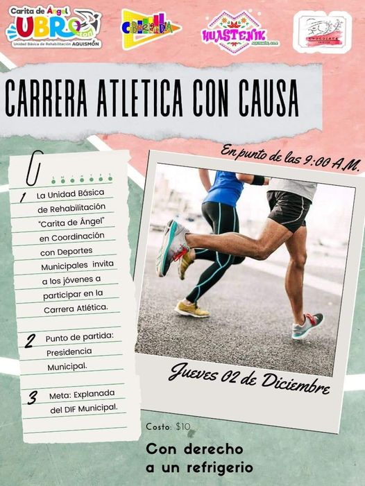 El Gobierno Municipal de Aquismon a través de la Unidad Básica de Rehabilitación “Carita de Ángel” en coordinación con el Departamento de Deportes te invita a que formes parte de una carrera atlética con causa este jueves 02 de diciembre en de las 9:00 horas frente al Palacio Municipal con un costo significativo de $10.00 por participante con derecho a un pequeño refrigerio patrocinado por las empresas locales Huastenik, Estética Chocolate y Ciberlandia.
