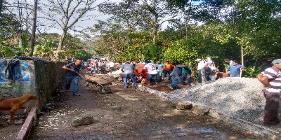 FUNCIONARIOS Y POBLADORES DE MÚHUATL EN LA ZONA TAMAPATZ PAVIMENTAN EL TRAMO DE ACCESO A LA LOCALIDAD.