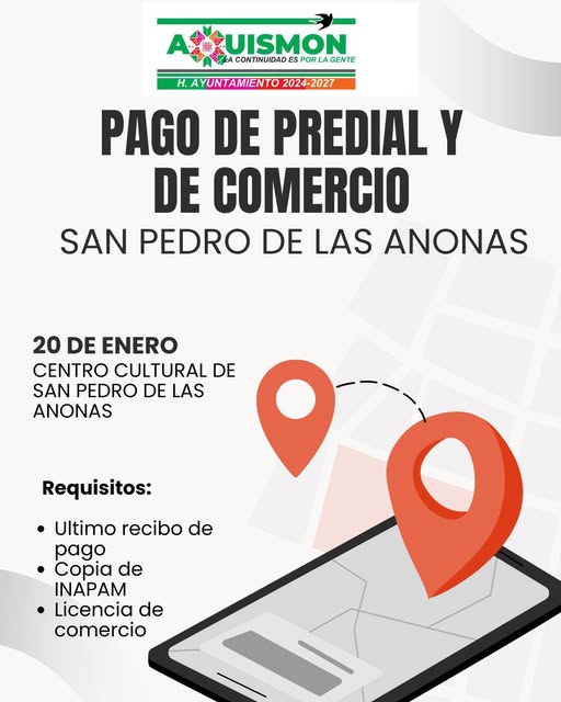 El Gobierno Municipal de Aquismón informa a la población de San Pedro de las Anonas y localidades aledañas, que con el objetivo de acercar los servicios y facilitar el cumplimiento de sus contribuciones, el martes 20 de enero estará instalado un módulo de atención.