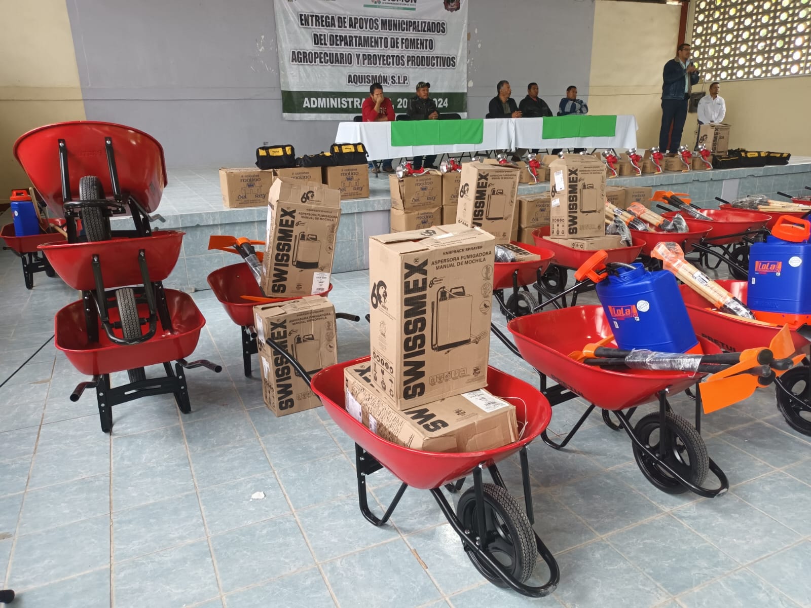 Aquismon.- El Ayuntamiento entregó esta mañana -a través de los departamentos de Fomento Agropecuario y Proyectos Productivos- más de un millón de pesos en apoyos a amas de casa, productores y trabajadores de varias zonas de Aquismón.