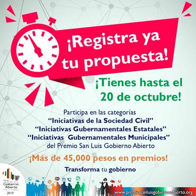 El contralor interno indicó que para todos los interesados, la fecha límite para el registro en línea de las “Iniciativas” participantes, es este próximo domingo 20 de octubre de 2019, dónde podrán consultar las características del premio y la convocatoria de la presente edición en la página: http://www.premiosanluisgobiernoabierto.org.