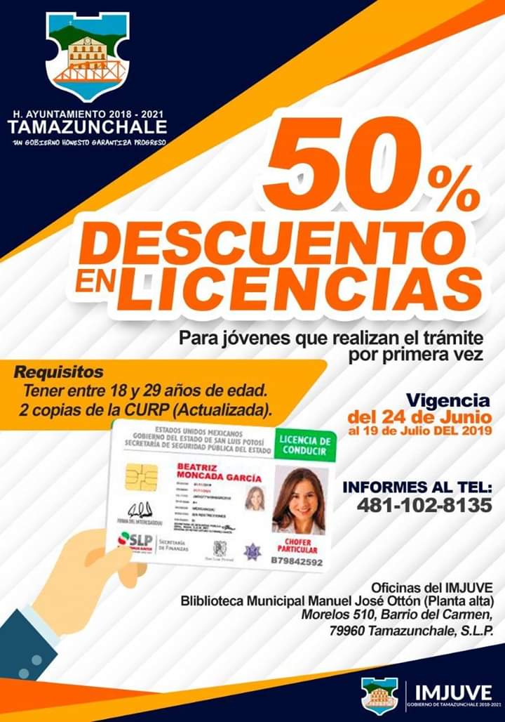 Para poder ser beneficiados con este descuento solo necesitan acudir con dos copias de su curp a la oficina de Imjuve Tamazunchale ubicadas en Calle Morelos #510 planta alta Barrio del Carmen del lunes 24 de Junio al 19 de Julio del 2019 de 8:00 am a 3:00 pm, el descuento y trámite solo es para los jóvenes que sea la primer ocasión que realizan este trámite para obtener su licencia; así mismo la delegación de Chapulhuacanito está recolectando documentación para todos los jóvenes interesados acudir en un horario de 8:00 am a 9:00 pm.