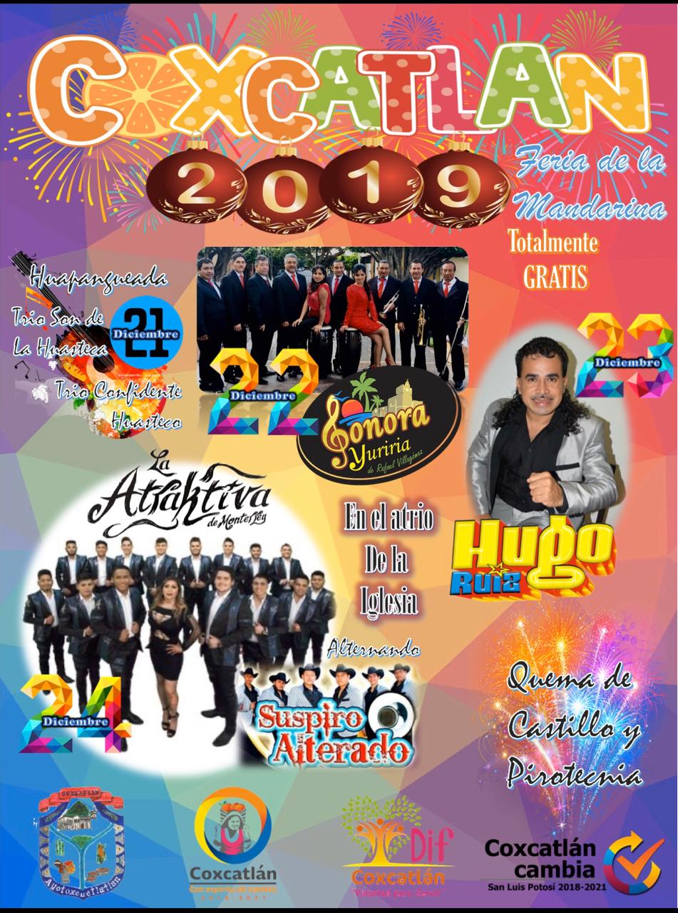 Coxcatlán, S.L.P.- El H. Ayuntamiento que dirige la Mtra. Ibeth Arenas Vidales a través Comité Organizador; dieron a conocer la cartelera artística de la “Feria de la Mandarina”, la cuál se desarrollará los días 22, 23 y 24 de diciembre del año en curso.