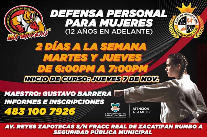 El curso de defensa personal para mujeres es totalmente gratuito e iniciará este próximo jueves 7 de noviembre en Av. reyes Zapotecas S/n Fracc Real de Zacatipan rumbo a Seguridad Pública Municipal, este curso se realizará los días martes y jueves de cada semana, en un horario de 6 a 7 de la tarde.