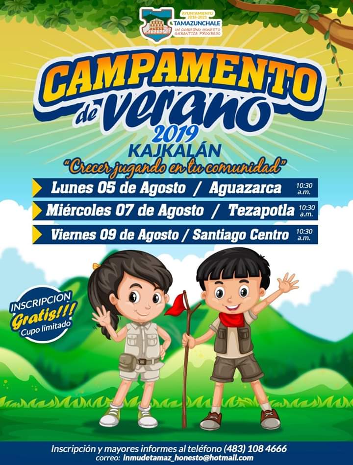 El Instituto Municipal del Deporte INMUDE se prepara para un nuevo campamento de verano que se realizará en la zona rural del municipio con el nombre “Crecer Jugando en tu Comunidad” teniendo como sedes tres localidades, Aguazarca, Tezapotla y Santiago Centro, el objetivo de este es el motivar a los niños y niñas de las comunidades de Tamazunchale al incorporarlos en algo novedoso, donde el punto central sea la convivencia; aunado a las actividades lúdicas y deportivas, así lo dio a conocer el Profesor Juan Enrique Espinoza Barrera director de este departamento.