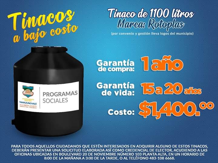 OFRECE EL GOBIERNO MUNICIPAL DE TAMAZUNCHALE TINACOS A BAJO COSTO.