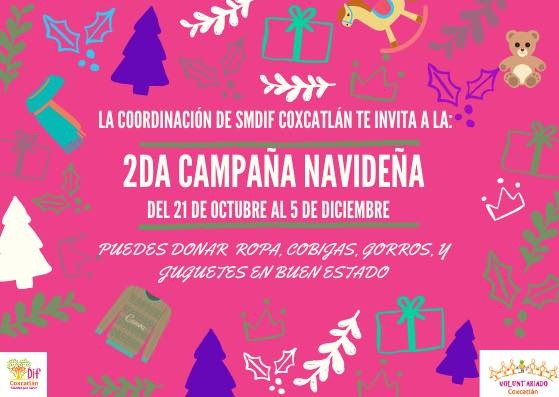 Coxcatlán, S.L.P.- El Sistema Municipal para el Desarrollo Integral de la Familia (SMDIF) que preside Ana Yansi Hernández Arenas en coordinación con el Voluntariado de Coxcatlán, llevaron a cabo el arranque oficial de la “2da. Campaña Navideña”, la cuál comprende desde hoy lunes 21 de octubre hasta el próximo 5 de diciembre del año en curso.