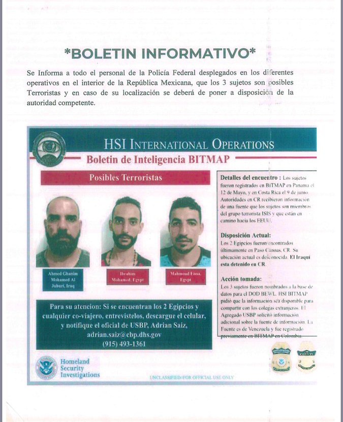 El ‘Boletín de Inteligencia Bitmap‘ señala que dos ciudadanos egipcios y un iraquí, ligados al Estados Islámico, se encuentran en Centroamérica con la intención de llegar a Estados Unidos, por lo que tendrían que pasar por México.