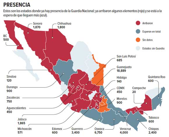 Los estados donde todavía no hay presencia formal de la Guardia son Nuevo León, Colima, Nayarit, Querétaro, Yucatán, Baja California Sur y Coahuila.