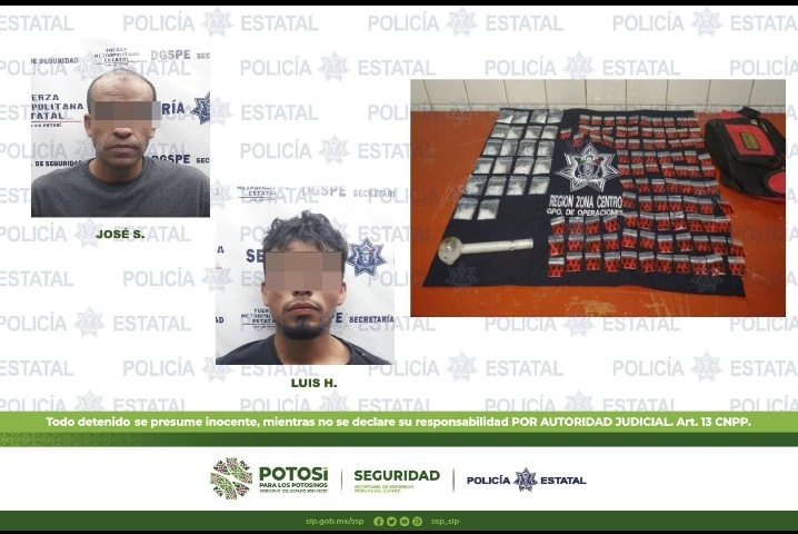 Los hechos fueron en Avenida San Pedro y Periférico Oriente, lugar en donde los Estatales detuvieron a Luis H., de 25 años de edad y a José S., de 39 años de edad, a quienes se les aseguraron 114 dosis de la droga sintética conocida como “cristal”.