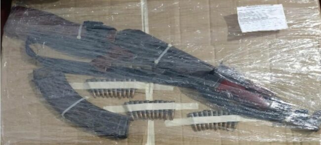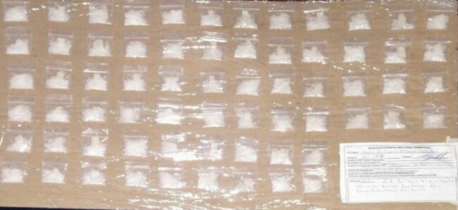 Al realizar una inspección en la unidad se localizó lo siguiente: 01 arma de fuego larga, tipo fusil de asalto, calibre 7.62 × 39, en color pavón negro con un cargador abastecido con 30 cartuchos útiles del mismo calibre, una caja de cartón en cuyo interior había 45 bolsas de nylon transparentes conteniendo marihuana con un peso total de 566 gramos y 66 bolsas tipo ziploc de nylon transparentes conteniendo la droga sintética granulada conocida como “cristal” con un peso total de 38.8 gramos así como 01 chaleco táctico en color negro.