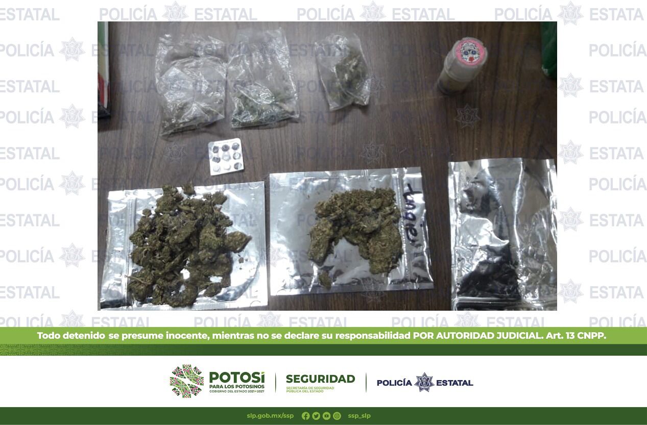 Fue en Avenida Salvador Nava Martínez y Avenida Chapultepec, donde los agentes Estatales detuvieron a dos mujeres y un hombre 15, 16 y 17 años de edad respectivamente, después de que se les aseguran 90 gramos de una hierba verde y seca con las características físicas de la marihuana, dividida en varias bolsas.