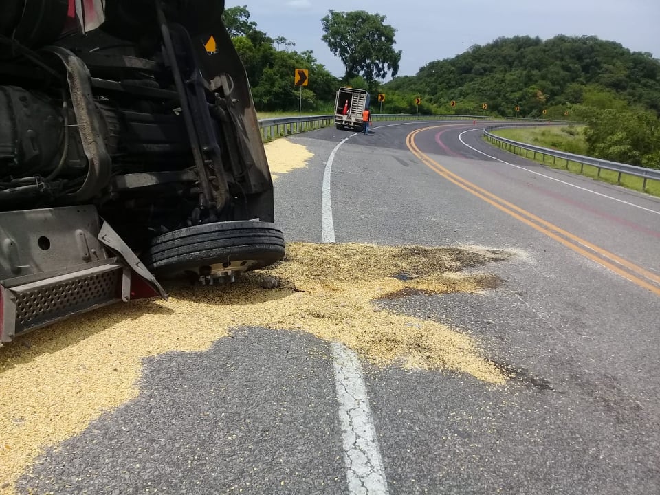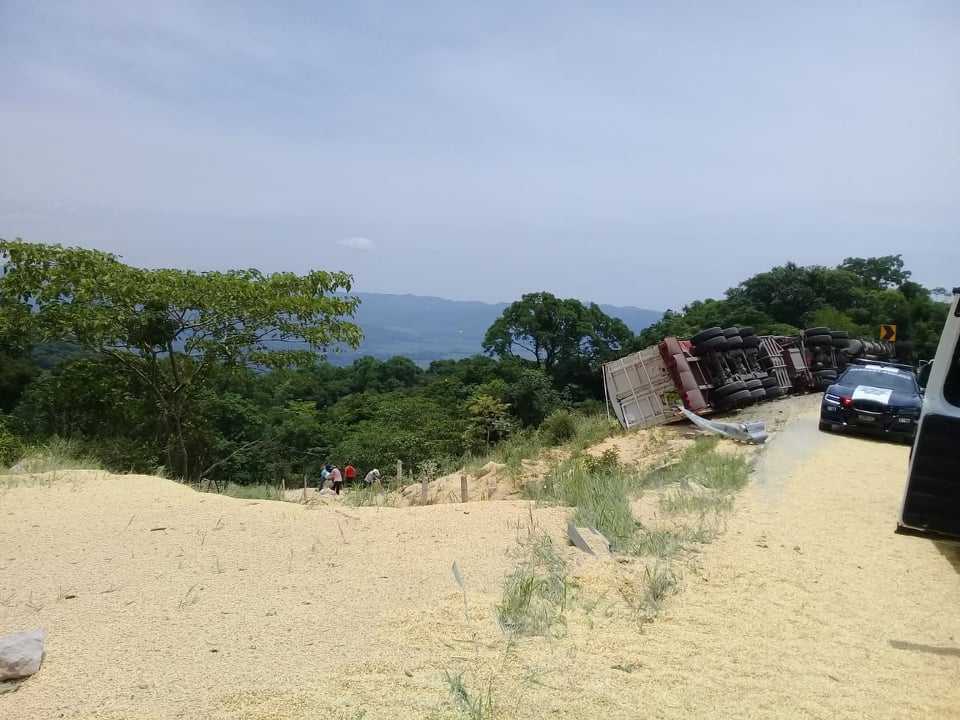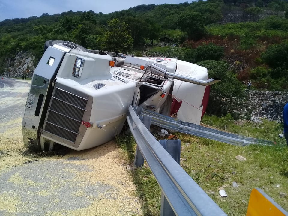 Tamasopo. S.L.P.- La tarde de hoy un tráiler que transportaba maíz volcó en la autopista Valles- Rayón dejando tirado por toda la carretera la carga que transportaba la unidad pesada, el chofer de la unidad resultó solo con golpes, al lugar acudieron la Policía Federal quien llevo a cabo el levantamiento del incidente.