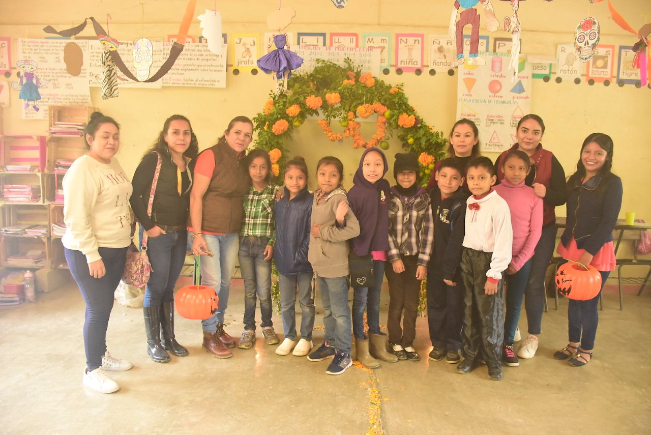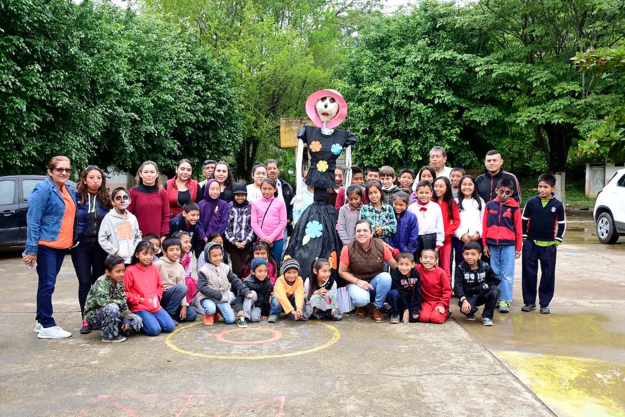 Fue en punto de las 11 de la mañana que la mandataria municipal arribo a la institución educativa, siendo recibida por la directora: Profra. Felicitas Morán Zárate, profesores, padres de familia y los más de 55 alumnos, quienes le organizaron comparsas, lectura de calaveritas, demostración de altares de muertos, por lo que la munícipe regaló a los infantes los tradicionales chichiliques (dulces).