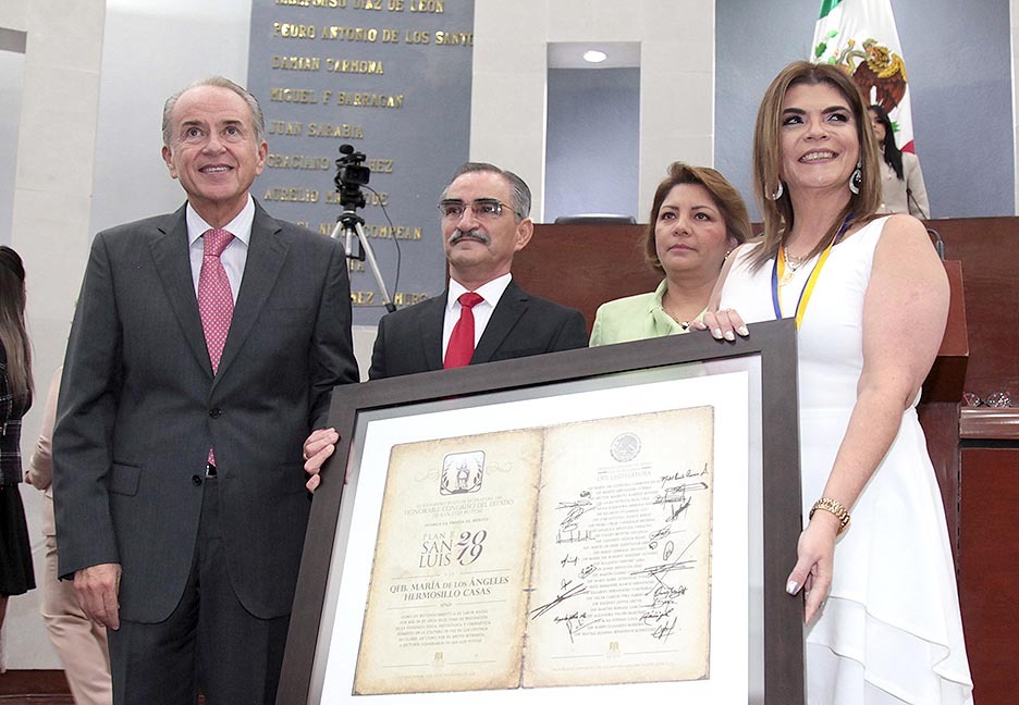 El pleno del Congreso del Estado entregó en Sesión Solemne la Presea al  Mérito “Plan de San Luis” Año 2019 a la  Q.F.B. María de los Ángeles Hermosillo Casas, por la destacada labor que realiza a través de las diversas organizaciones civiles sin fines de lucro, principalmente encaminado a la atención y prevención del acoso escolar o bullying.