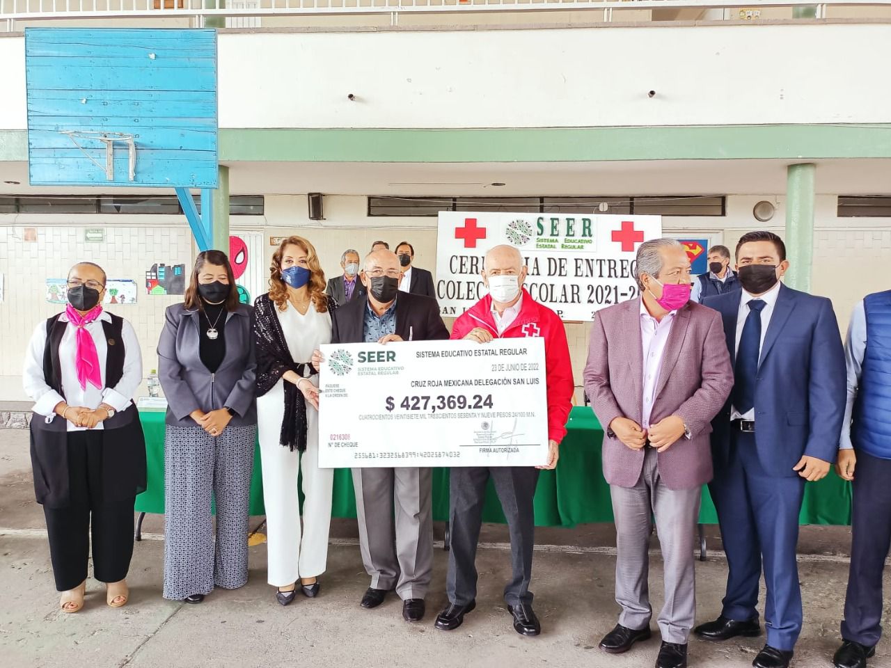 Como resultado de la campaña de educación social emprendida por el Sistema Educativo Estatal Regular de San Luis Potosí, entre directivos, docentes, alumnas y alumnos de 470 escuelas oficiales y particulares de los diferentes niveles educativos de la capital, la comunidad SEER entregó a la delegación de la Cruz Roja Mexicana la cantidad de 427 mil 369 pesos con 24 centavos, producto de la Colecta 2021-2022.