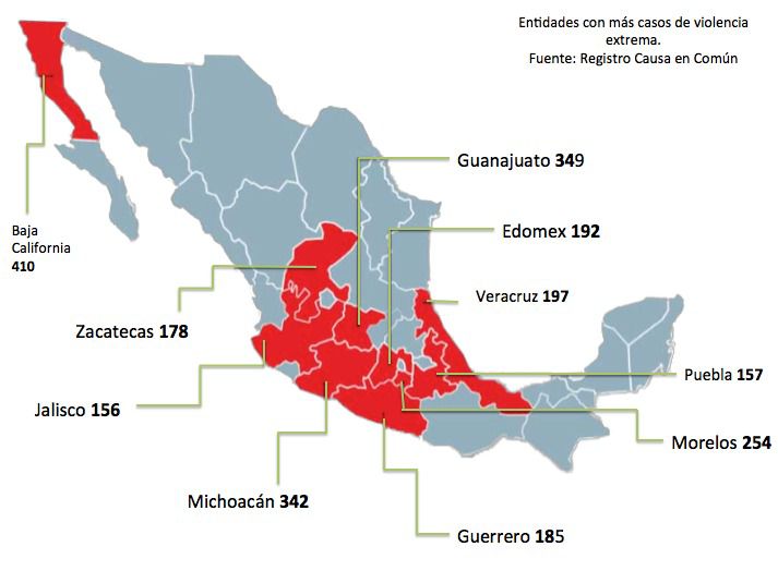Causa en Común reporta que de los más de 4 mil actos de violencia extrema en diversas modalidades, Baja California se posiciona en el primer lugar con 410 atrocidades –entendiéndose como el uso intencional de la fuerza física para causar muerte, laceración o maltrato extremo; para causar la muerte de un alto número de personas; para causar la muerte de personas vulnerables o de interés político, y/o para provocar terror-; seguido de Guanajuato con 349 casos.