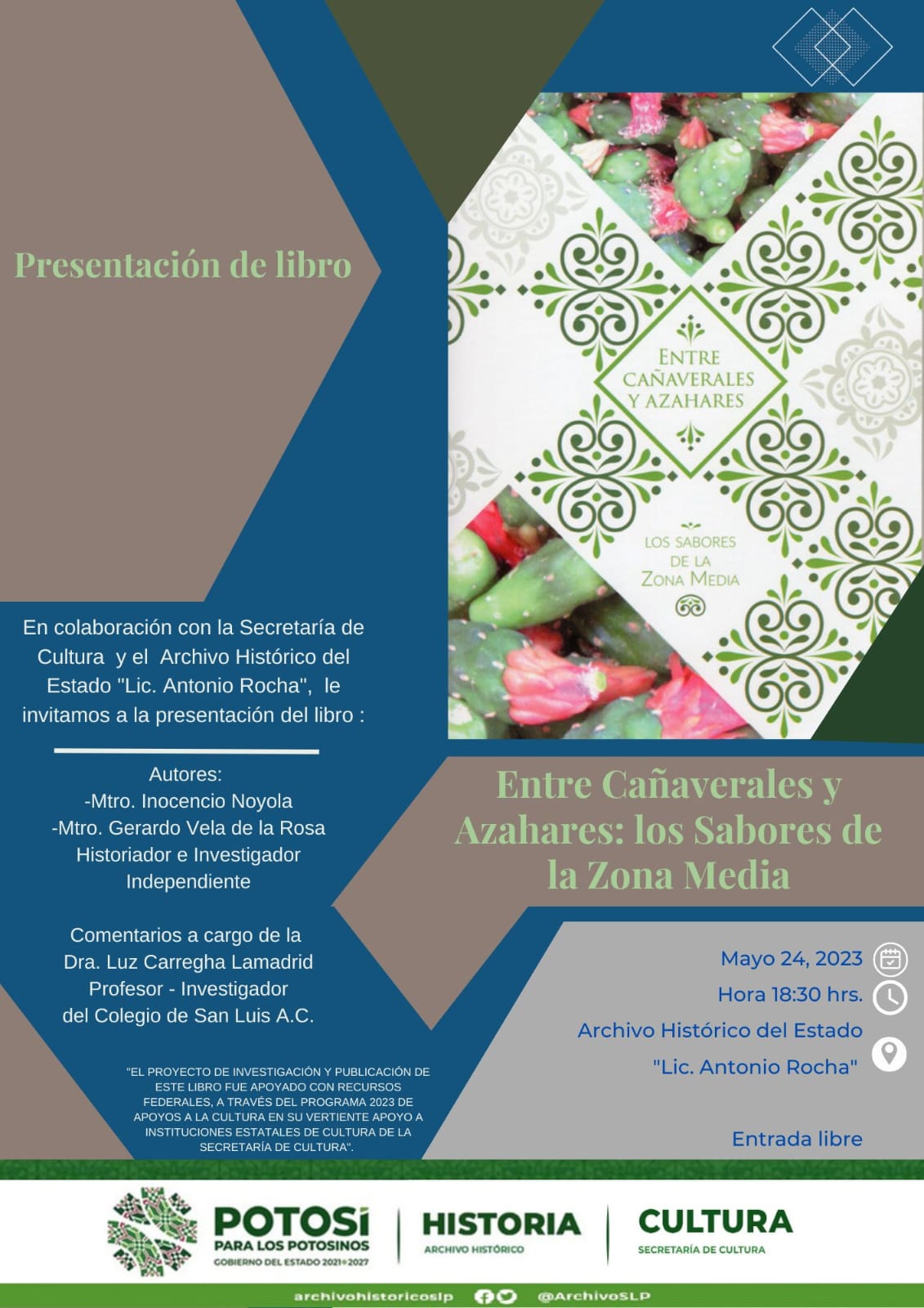 En respaldo a la preservación de las tradiciones y las expresiones de la cocina tradicional, como lo ha impulsado el Gobernador de San Luis Potosí, Ricardo Gallardo Cardona, desde el arranque del Gobierno del cambio, el próximo miércoles 24 de mayo, en punto de las 18:30 horas, el Archivo Histórico del Estado “Lic. Antonio Rocha”, albergará la presentación del libro: “Entre cañaverales y azahares, los sabores de la zona Media”, a cargo de sus autores Inocencio Noyola y Gerardo Vela.