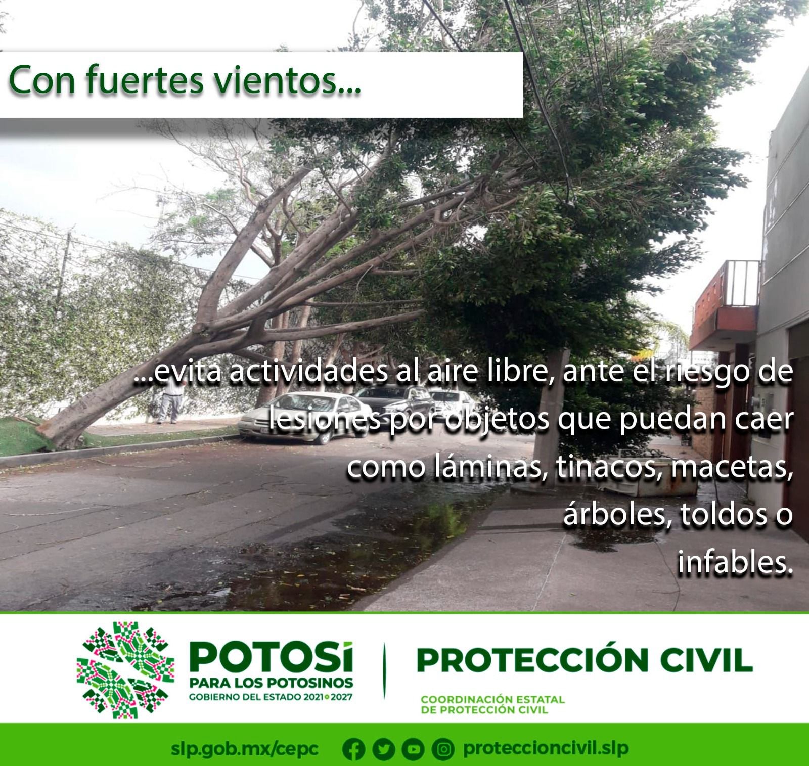 Solicitó a la población tomar en cuenta las recomendaciones: evitar actividades al aire libre ante el riesgo de lesiones por objetos que puedan ser lanzados o desprendidos como árboles o ramas, cables, toldos, lonas, láminas o espectaculares; en el hogar e inmuebles, recomendó asegurar ventanas, así como objetos como láminas, macetas, lámparas, tinacos vacíos, lonas y evitar la colocación de toldos y juegos inflables.