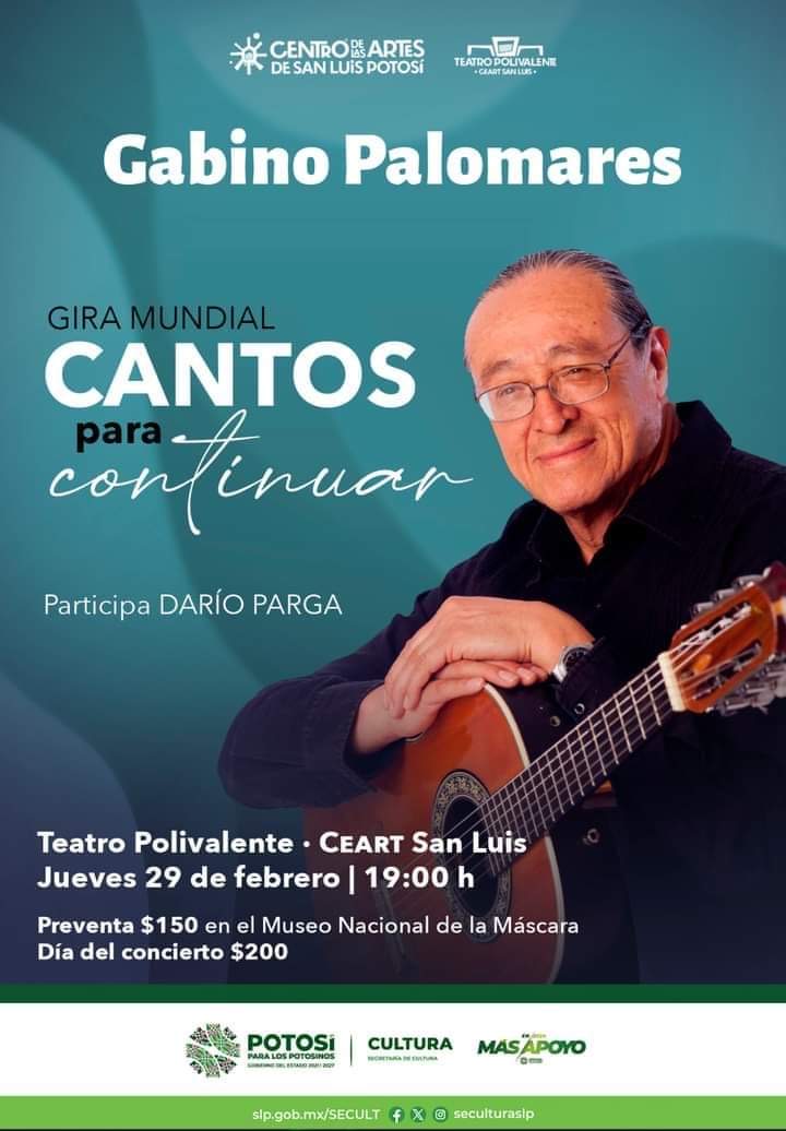 El Gobierno del Estado, a través de la Secretaría de Cultura (Secult), invita a las y los potosinos a deleitarse con la gira mundial “Cantos para continuar” del cantautor Gabino Palomares, evento que se realizará este jueves en punto de las 19:00 horas en el teatro Polivalente del Centro de las Artes.