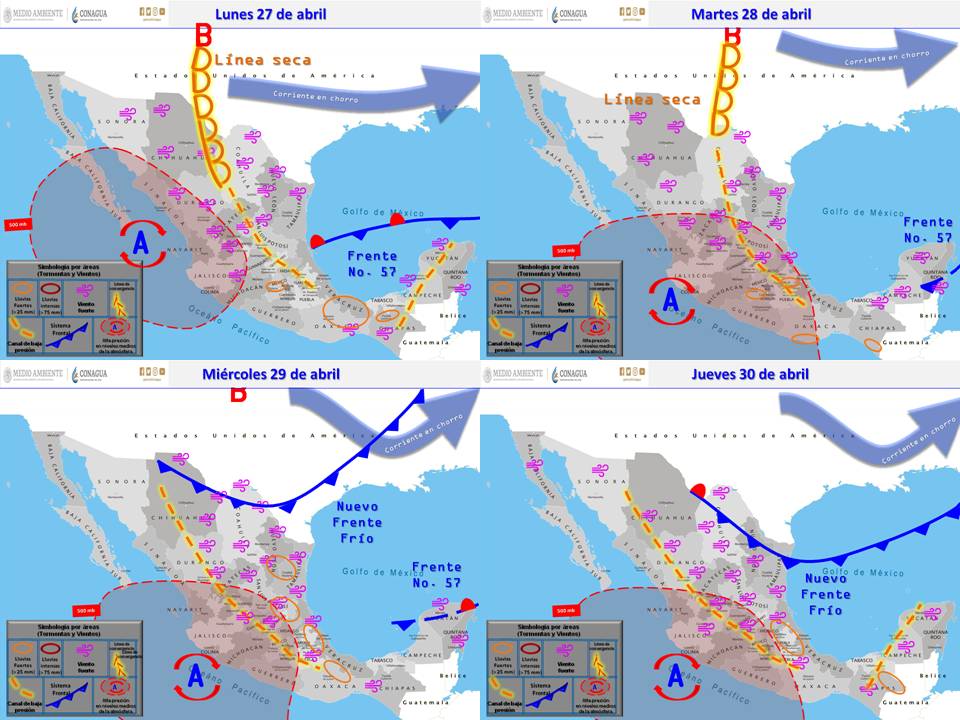 Durante el transcurso del martes 28 de abril un nuevo frente frío se aproximará a la frontera norte del país, recorrerá el norte y noreste del territorio durante el miércoles 29 ocasionado viento con rachas de 70 a 80 km/h en las regiones mencionadas, así como chubascos y lluvias puntuales fuertes en el noreste y oriente de México.