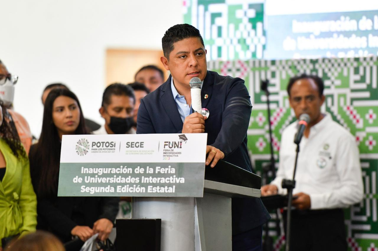 El Gobierno del cambio activa oportunidades de crecimiento a favor de las y los jóvenes en San Luis Potosí, para que tengan un mejor futuro y para que nadie se quede atrás, destacó el Gobernador del Estado, Ricardo Gallardo Cardona, en el arranque de la Feria de Universidades Interactiva (FUNI) 2023 en la que participan al menos seis mil jóvenes de bachillerato que buscan acceder a alguna de las universidades públicas o privadas que se ofertan.