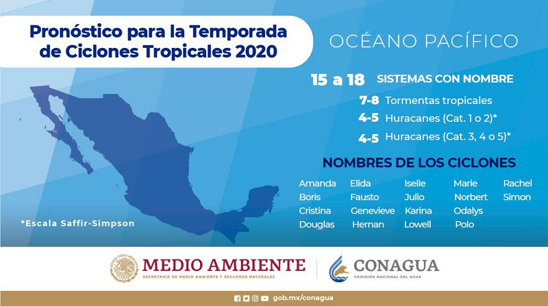 Para este 2020, la Conagua indicó que se pronostica que la Temporada Ciclones Tropicales sea más activa, en promedio se esperan de 30 a 37 fenómenos. En promedio se prevén para la zona del Pacífico Nororiental de 15 a 18 de los cuales pudieran presentarse como tormentas tropicales entre 7 y 8, como huracanes categoría 1 y 2 de 4 a 5 huracanes, como huracanes categoría 3, 4 y 5 en promedio pudieran generarse de 4 a 5 fenómenos, en el caso del Atlántico Norte se pronostican de 15 a 19 huracanes, promediando de 8 a 10 tormentas tropicales, de 4 a 5 huracanes categoría 1 y 2 y huracanes categoría 3,4 y 5 se podrían esperar de 3 a 4 fenómenos climatológicos.