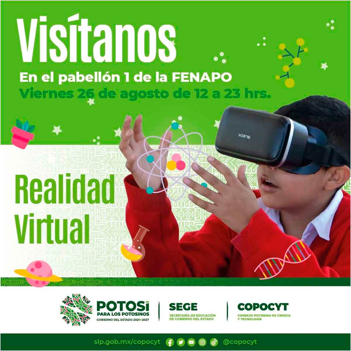 El Consejo Potosino de Ciencia y Tecnología (Copocyt) preparó un evento especial de realidad virtual que se llevará a cabo este viernes 26 de agosto en el módulo de la Secretaría de Educación del Gobierno del Estado (SEGE) de la Feria Nacional Potosina (Fenapo) edición 2022, donde las y los asistentes podrán disfrutar de un viaje espacial en un cohete o visitar la gran ciudad de Hong Kong de noche, como parte de las actividades que el Gobierno del cambio que encabeza Ricardo Gallardo Cardona ha impulsado en esta feria de servicios.