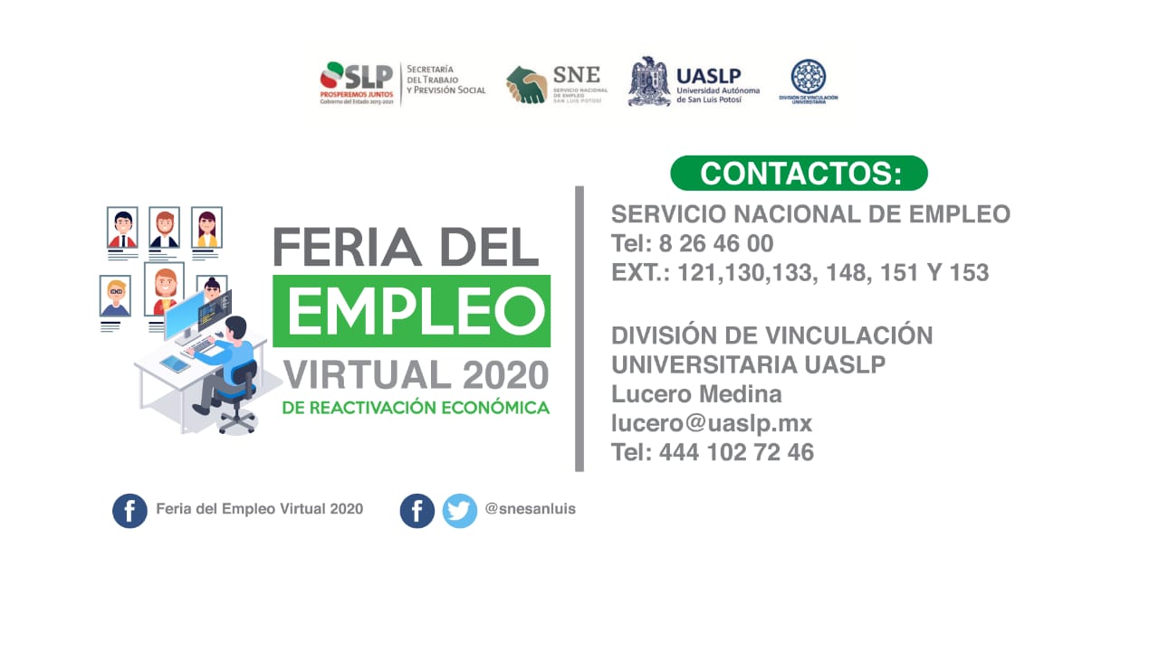 La Secretaría del Trabajo y Previsión Social (STPS) del Gobierno del Estado, a través del Servicio Nacional de Empleo y en coordinación con la Universidad Autónoma de San Luis Potosí (UASLP), invitan a la Primera Feria Virtual de Empleo 2020 de Reactivación Económica, que se llevará a cabo el próximo jueves 28 de mayo, donde al menos 50 empresas ofertarán más de 2 mil 400 vacantes.
