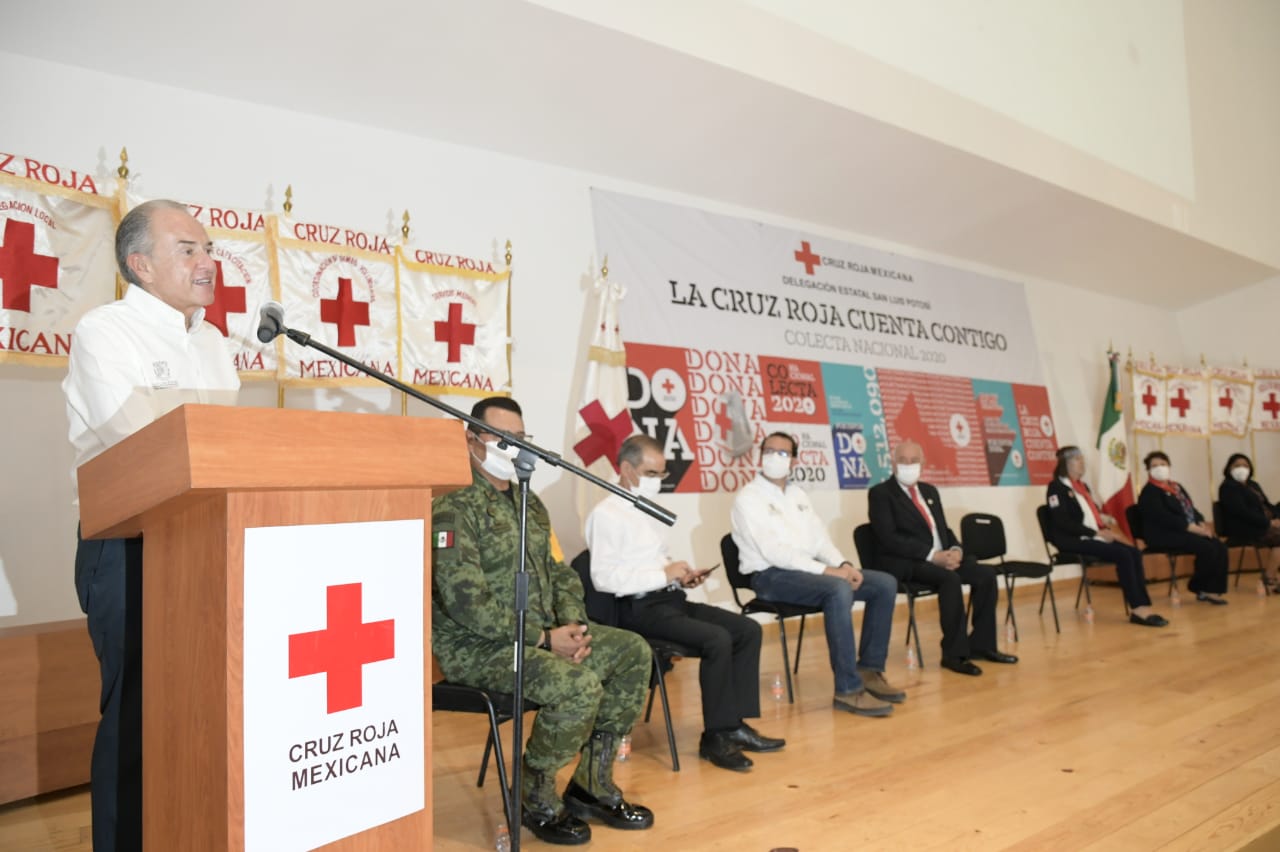 En el marco del arranque de la Colecta 2020 de la Cruz Roja Mexicana en San Luis Potosí, el Gobernador Juan Manuel Carreras López, acompañado de la Presidenta Honoraria de la institución, Lorena Valle Rodríguez y del delegado de la misma, Jesús Ernesto de la Maza Jiménez, convocan a la sociedad y a los sectores público y privados a solidarizarse con esta organización humanitaria con donativos vía electrónica, ya que desempeña una labor imprescindible, y que aporta con la atención cotidiana pre hospitalaria durante la actual emergencia sanitaria por el COVID-19.