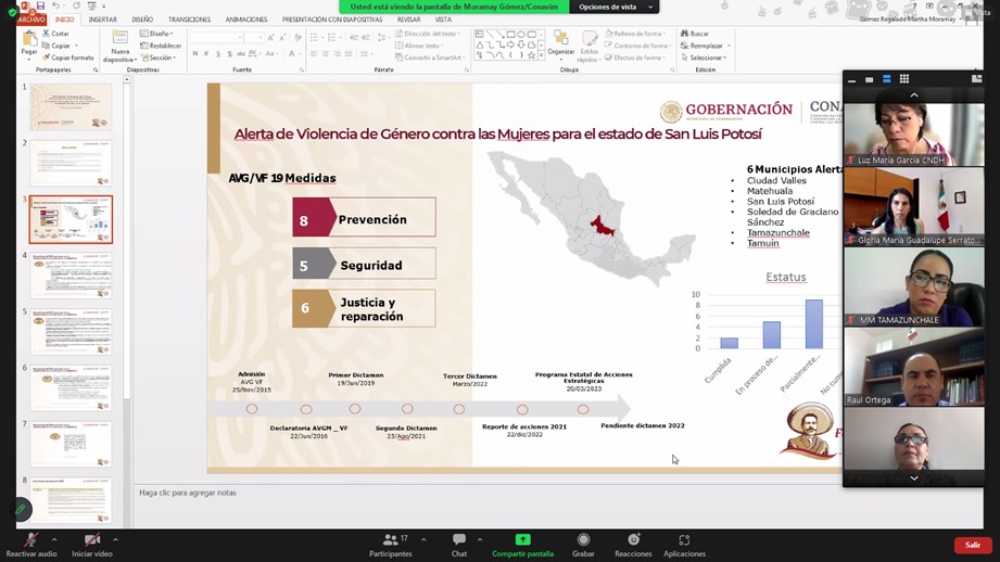 Gloria Serrato Sánchez, directora general de la dependencia, explicó que, a través de este encuentro virtual, se coordinaron acciones para atender lo establecido sobre la declaratoria de Alerta de Violencia de Género contra las mujeres en los municipios de: Ciudad Valles, Matehuala, San Luis Potosí, capital, Soledad de Graciano Sánchez, Tamazunchale y Tamuín, para brindar información a los Ayuntamientos y elaboren su Programa Municipal de Acciones Estratégicas.