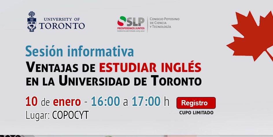 El Consejo Potosino de Ciencia y Tecnología (COPOCYT), en colaboración con The University of Toronto School of Continuing Studies (SCS) en Canadá, convocan a la sesión informativa sobre las ventajas de estudiar inglés en esa institución educativa que se llevará a cabo el 10 de enero de 2020.