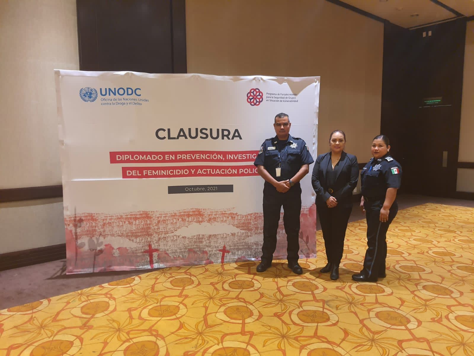 Como parte de las acciones preventivas y académicas para reforzar las estrategias de actuación policial ante los hechos de violencia de género, la Directora de la Academia de Seguridad Pública del Estado (ASPE), así como elementos adscritos a la Unidad de Género de esta corporación, acudieron al cierre de actividades del Diplomado en Prevención, Investigación del Feminicidio y Actuación Policial, dentro del Programa de Fortalecimiento para la Seguridad de Grupos en Situación de Vulnerabilidad de la ONUDC, que fue realizado en la CDMX.
