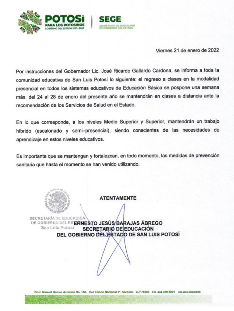 Las clases presenciales en educación básica en San Luis Potosí se pospondrán una semana más y se trabajará a distancia del 24 al 28 de enero del presente año, informó la Secretaría de Educación de Gobierno del Estado (SEGE), tras la determinación del Mandatario Estatal Ricardo Gallardo Cardona en atención a las recomendaciones de las autoridades de Salud ante el cambio de semáforo sanitario a color naranja.