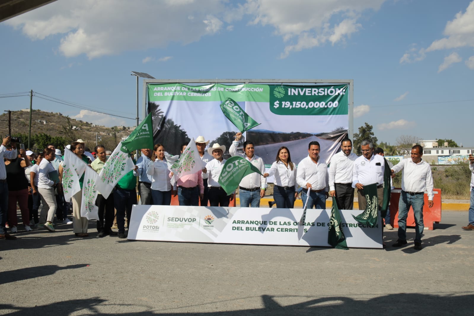 Cerritos, San Luis Potosí.- Con el reconocimiento de beneficiarios y alcaldes de la región Media el Gobernador de San Luis Potosí, Ricardo Gallardo Cardona, acudió este martes a Cerritos para arrancar la construcción del bulevar Camino Cerritos-Villa Juárez con una inversión de 19.15 millones de pesos con impacto en más de 23 mil usuarios. Además, realizó la entrega de apoyos agropecuarios para los productores de la región.