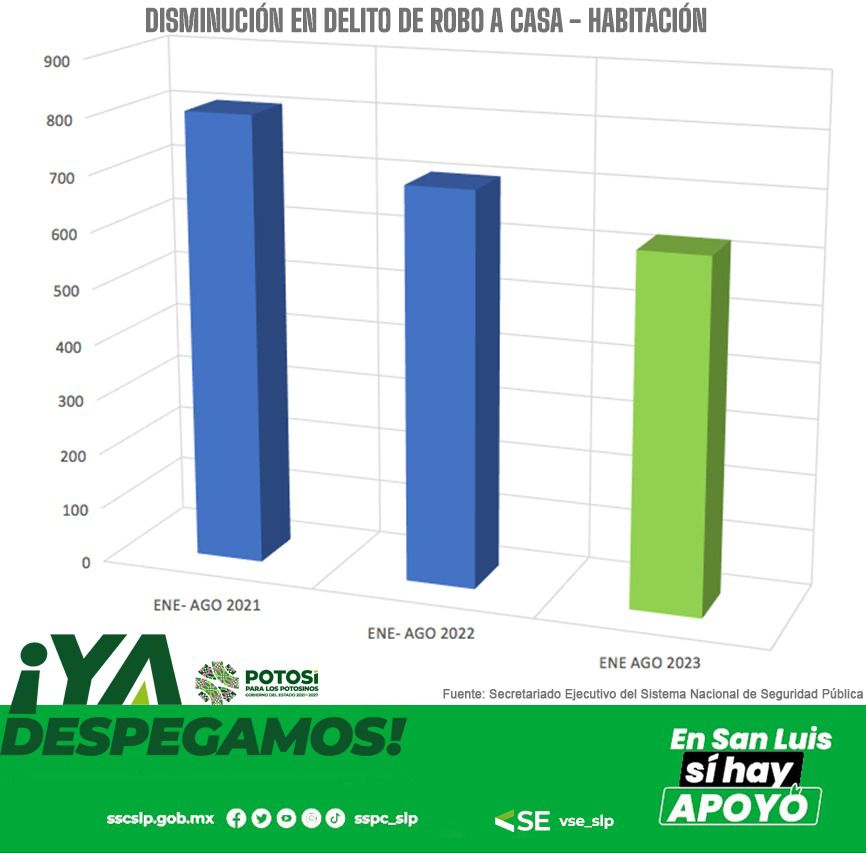 El titular de la dependencia estatal, Miguel Gallegos Cepeda, dijo que, de acuerdo con las cifras del Secretariado Ejecutivo del Sistema Nacional de Seguridad Pública (SESNSP), presentado esta mañana en la conferencia matutina del Presidente de la República Mexicana, Andrés Manuel López Obrador, por la titular de la Secretaría de Seguridad y Protección Ciudadana, Rosa Icela Rodríguez, de 2021 a la fecha, en la entidad potosina delitos como secuestro, homicidio doloso y robo a casa, disminuyeron un 50, 32 y 22 por ciento, respectivamente.