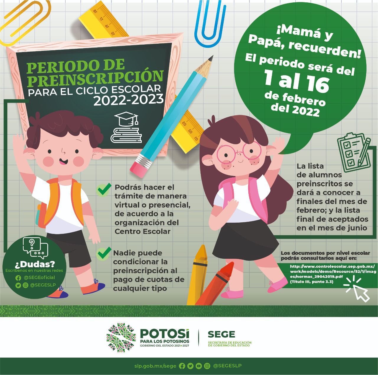 En cumplimiento a las políticas públicas en el nuevo Gobierno potosino, para garantizar el derecho a la educación de niñas, niños y adolescentes, la Secretaría de Educación de Gobierno del Estado de San Luis Potosí (SEGE), informa que, a partir del primero y hasta el 16 de febrero del presente año, se llevará a cabo el proceso de preinscripción para el ciclo escolar 2022-2023 en las escuelas públicas de educación básica del Estado.