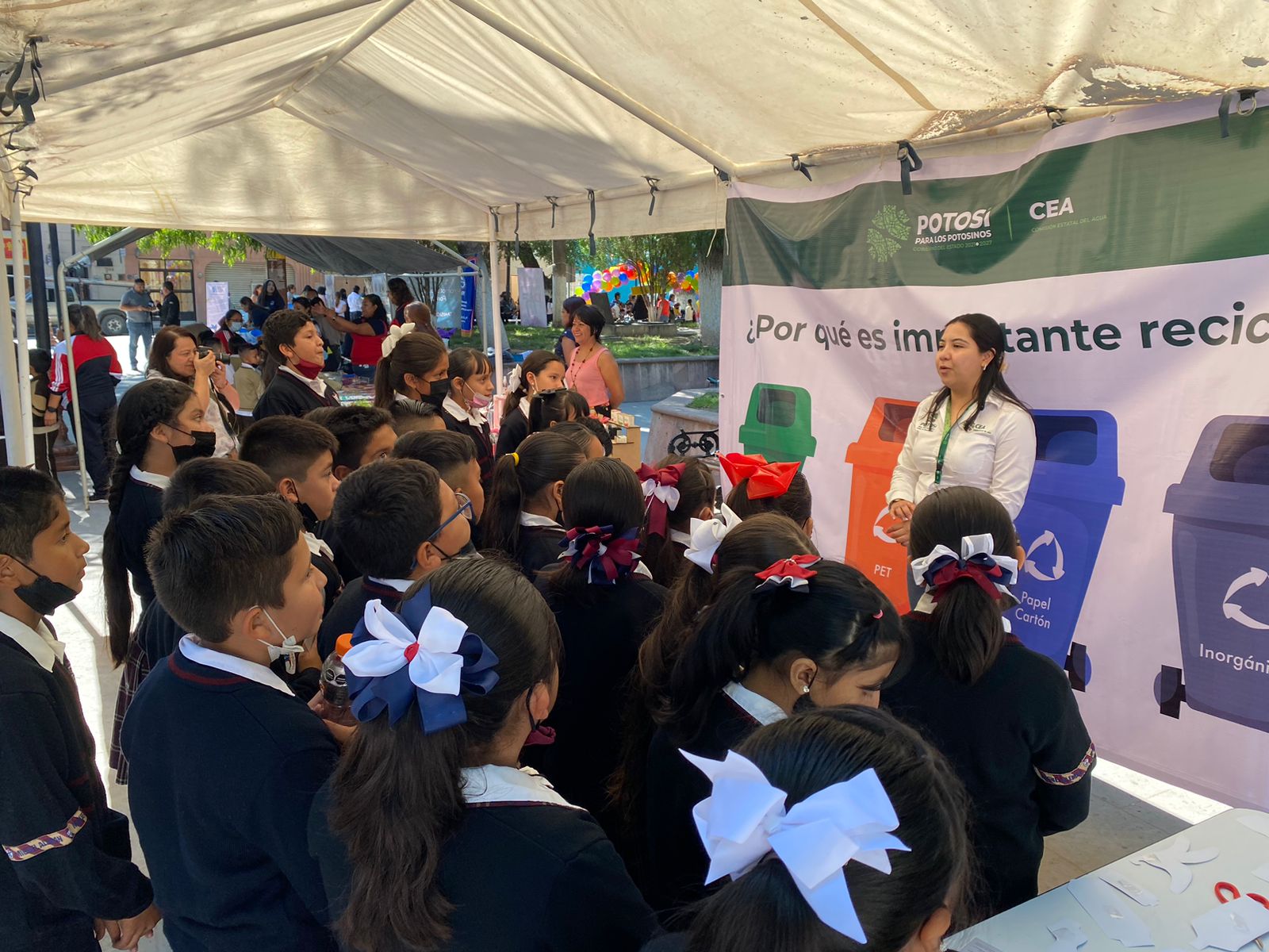 El público, en su mayoría niñas y niños de escuelas de este municipio, recibieron información sobre la importancia del cuidado y aprovechamiento del agua, además de que se abordó la relevancia del reciclaje de desechos inorgánicos para la supervivencia en el planeta, el cuidado del medio ambiente y el respeto a la vida de las plantas y animales.