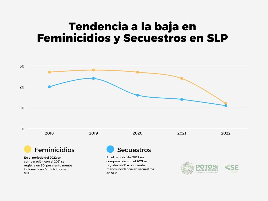 Durante el año 2022, de acuerdo con el informe del Secretariado Ejecutivo del Sistema Nacional de Seguridad Pública (SESNSP), el Estado de San Luis Potosí obtuvo una disminución del 50 por ciento en feminicidios; 21.4 por ciento en secuestros; 13 por ciento en robo de motocicletas; así como un 11 por ciento en homicidios dolosos y culposos.