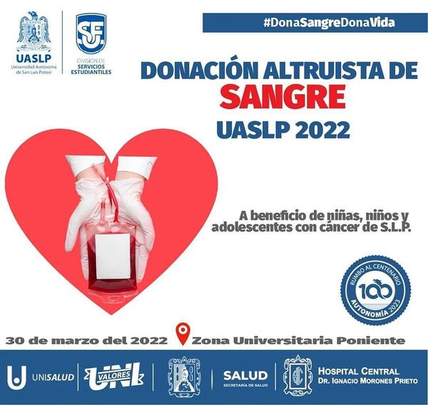 La coordinaciĂłn del Centro Estatal de TransfusiĂłn SanguĂ­nea (CETS) de los Servicios de Salud (Ssa) y la Universidad AutĂłnoma de San Luis PotosĂ­ (UASLP) llevarĂĄn a cabo una campaĂąa de donaciĂłn de sangre el prĂłximo miĂŠrcoles 30 de marzo, con el objetivo de apoyar a niĂąas, niĂąos y adolescentes con cĂĄncer.