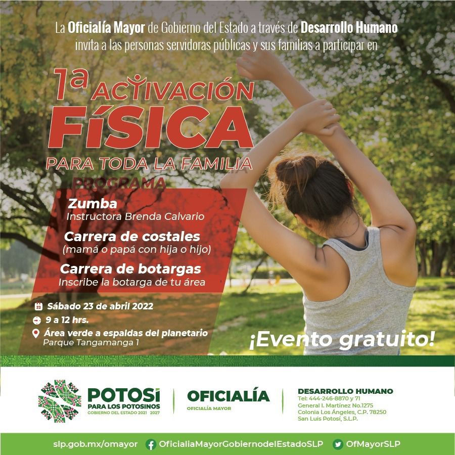 Con el propósito de fomentar la actividad física y la práctica deportiva entre la base trabajadora, la Oficialía Mayor de Gobierno del Estado invita a las y los servidores públicos y sus familias a que asistan este sábado 23 de abril a la primera sesión de actividad física que se llevara a cabo en el área verde ubicada atrás del Planetario del Parque Tangamanga 1, de las 09:00 a las 12:00 horas.