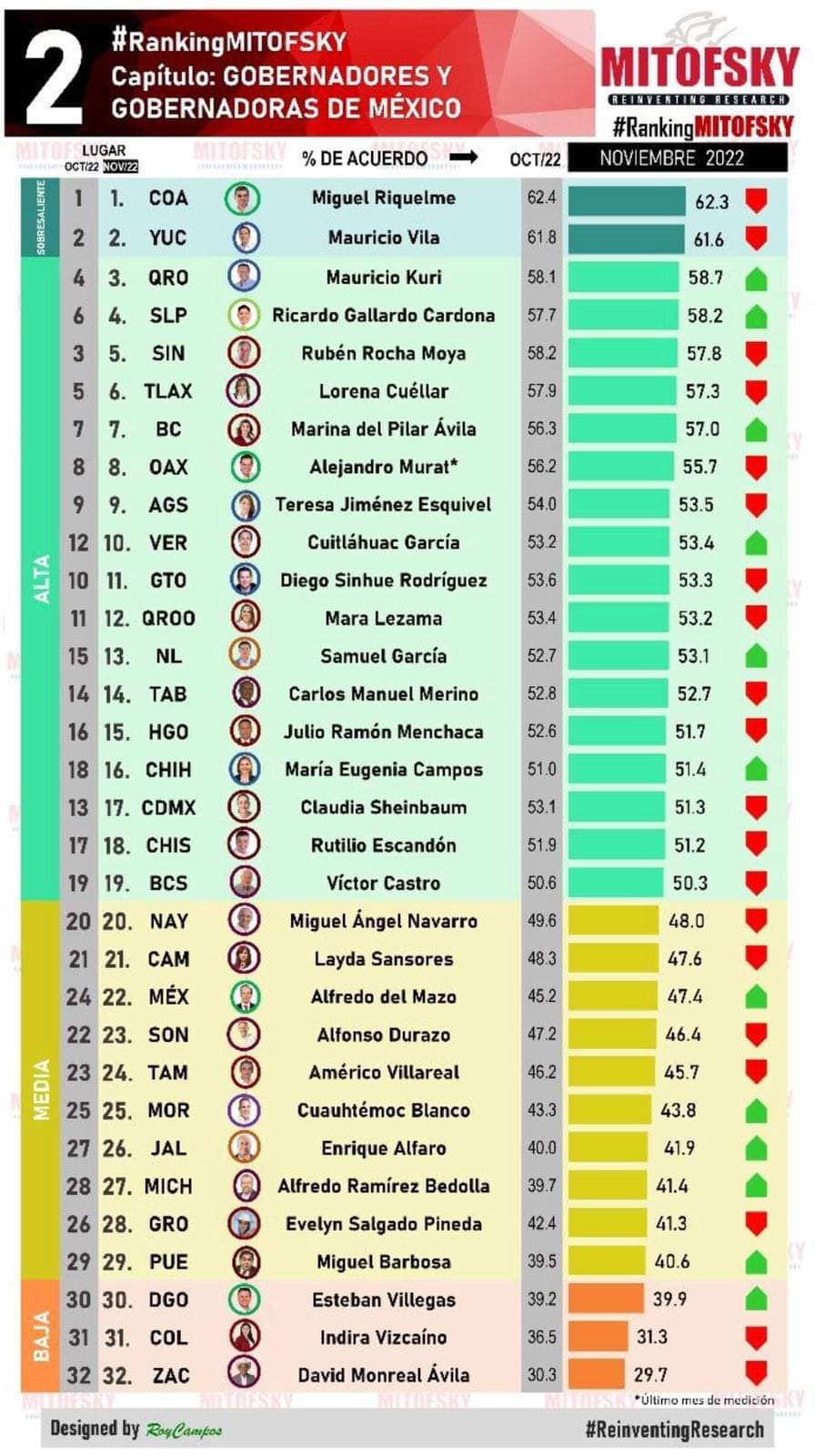 Además, los resultados en la calificación global, lo ubicaron en la cuarta posición de la totalidad de las y los gobernadores, con Coahuila a la cabeza, seguido de Yucatán, Querétaro y San Luis Potosí, con apenas un ligero porcentaje por debajo de la calificación más alta que fue del 62.3 de aprobación ciudadana.