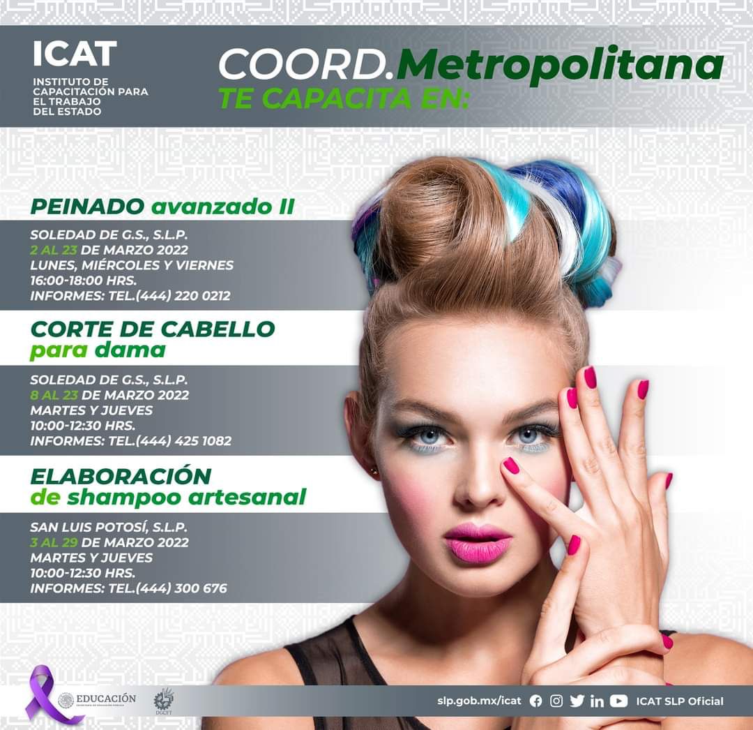 El programa de cursos se llevará a cabo en las dos Unidades de la zona metropolitana, ubicadas en la colonia Santa Mónica en Soledad de Graciano Sánchez, y en la colonia Estadio en la capital. Se invita a las y los interesados a ser parte de estos nuevos talleres a que consulten en las redes sociales del Instituto: www.facebook.com/ICATSANLUISPOTOSI, las fechas de inicio y horarios.