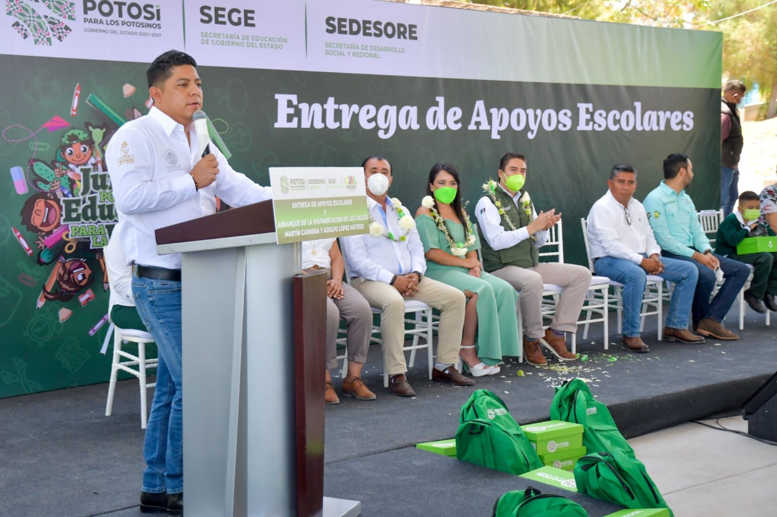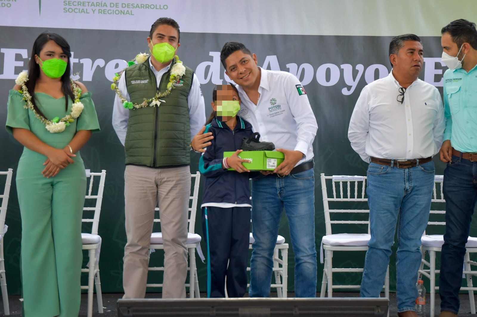 En la gira por Tierra Nueva, Gallardo Cardona también entregó una parte de los 967 paquetes escolares y una parte de los más de 250 pares de zapatos para niñas, niños y jóvenes del municipio, lo que contribuirá a mejorar la educación pública en el Estado y la economía de las familias.