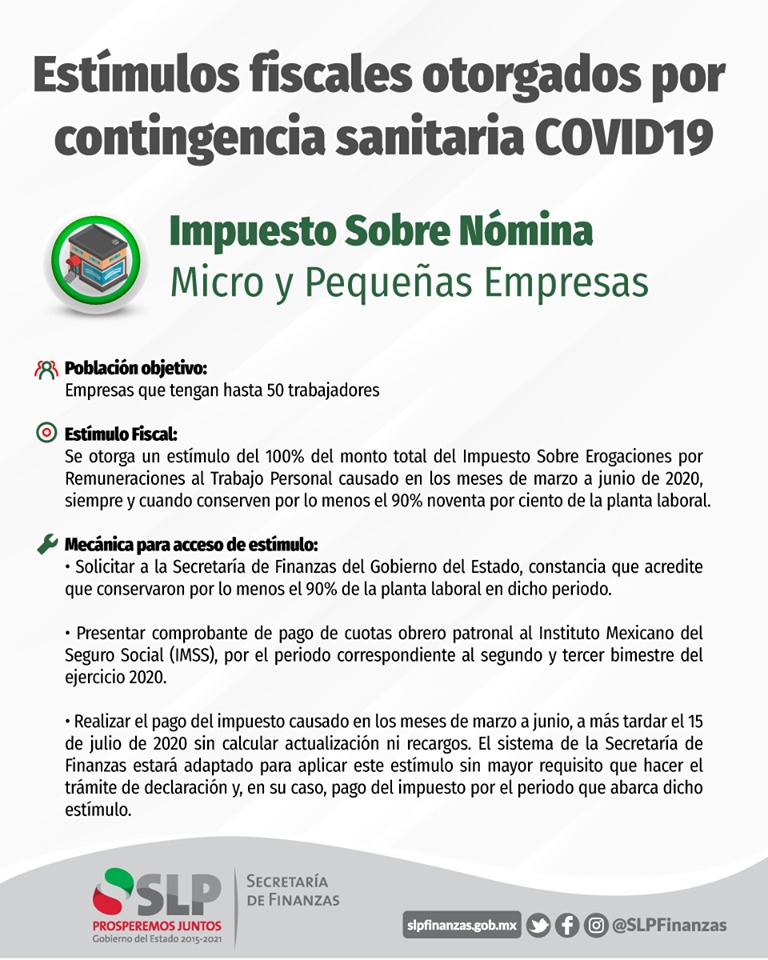 El Secretario de Finanzas de Gobierno del Estado (SEFIN), Daniel Pedroza Gaitán, dio a conocer que, de marzo a junio del año 2020, la Administración Estatal que encabeza Juan Manuel Carreras López, otorga un estímulo del 100 por ciento del monto total del Impuesto Sobre Erogaciones por Remuneraciones al Trabajo Personal a micro y pequeñas empresas, como parte de las Medidas de Apoyo Económico por la contingencia sanitaria por Covid-19.