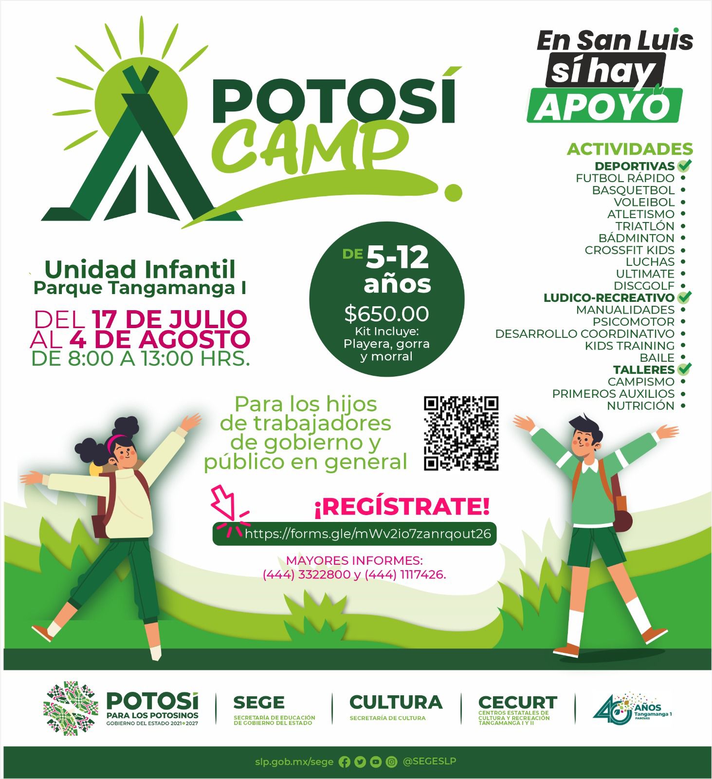 Este lunes inició el “Campamento Potosí”, en la Unidad Infantil del parque Tangamanga I, del 17 de julio al 4 de agosto, en un horario de 8:00 a 13:00 horas, de lunes a viernes, en apoyo de niñas y niños de 5 a 12 años, para que tengan un desarrollo integral con actividades lúdicas recreativas, artísticas y deportivas.